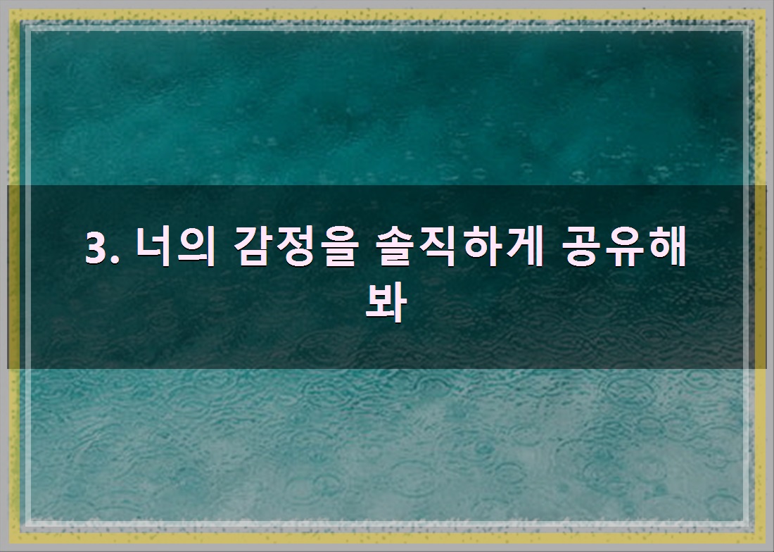 ENFJ는 감정 표현에 솔직하고, 파트너도 자기 감정을 편하게 이야기하는 걸 좋아해. 너의 기분이나 생각을 솔직하게 털어놓고, 그의 감정에도 따뜻하게 공감해 주는 게 중요해. "오늘 하루 어땠어?"라는 질문으로 부드럽게 대화를 시작해 보는 건 어때